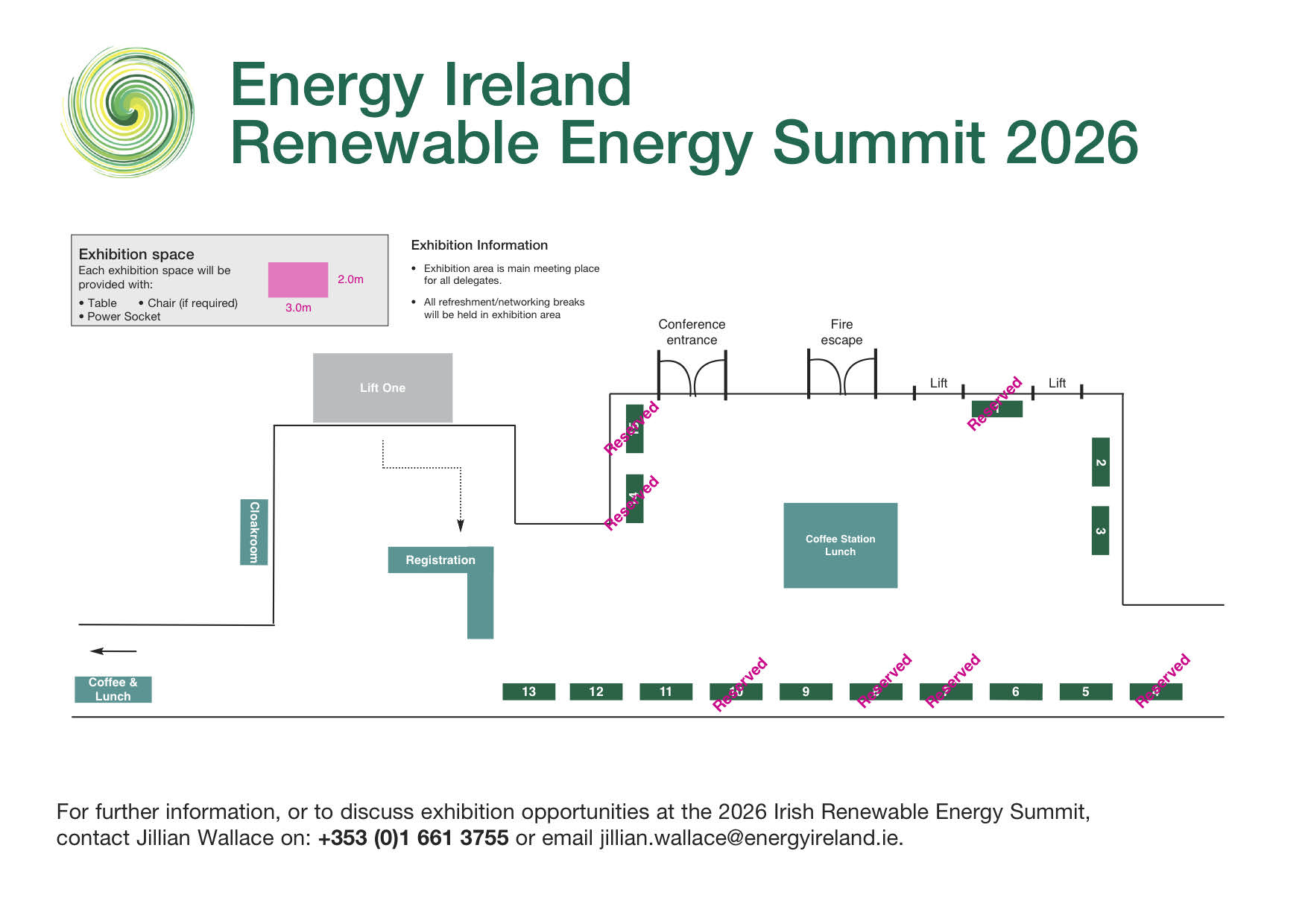 There are a limited number of opportunities to become involved with this conference as a sponsor or exhibitor. This is an excellent way for organisations to showcase their expertise and raise their profile with a key audience of senior decision makers from across Ireland’s renewable energy sector. For further information on how your organisation can benefit, contact Jillian Wallace on +353 (0)1 661 3755 or email Jillian.wallace@energyireland.ie